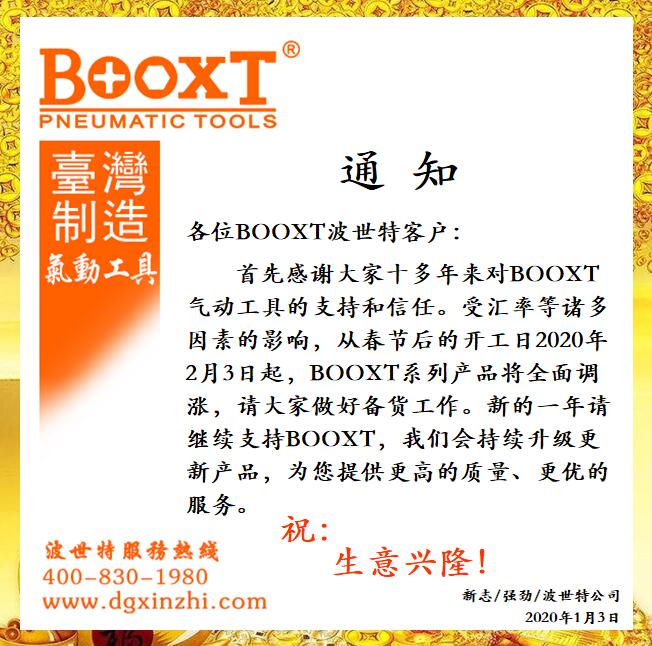 首先感謝大家十多年來對BOOXT氣動工具的支持和信任。受匯率等諸多因素的影響,從春節(jié)后的開工日2020年2月3日起,BOOXT系列產(chǎn)品將全面調(diào)漲,請大家做好備貨工作。新的一年請繼續(xù)支持BOOXT,我們會持續(xù)升級更新產(chǎn)品,為您提供更高的質(zhì)量,更優(yōu)的服務。