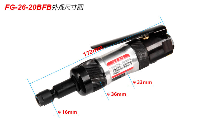 • 產(chǎn)品參數(shù): 夾頭能力:M6 馬達(dá)功率:0.35HP 空載轉(zhuǎn)速:24000rpm 工具能力:砂輪磨頭M25,旋轉(zhuǎn)銼刀M13 耗 氣 量:0.45m3/min 全 長:172mm 重 量 : 0.62kg 噪 音 值:83db(A) 【工業(yè)型/扳機(jī)式開關(guān)】